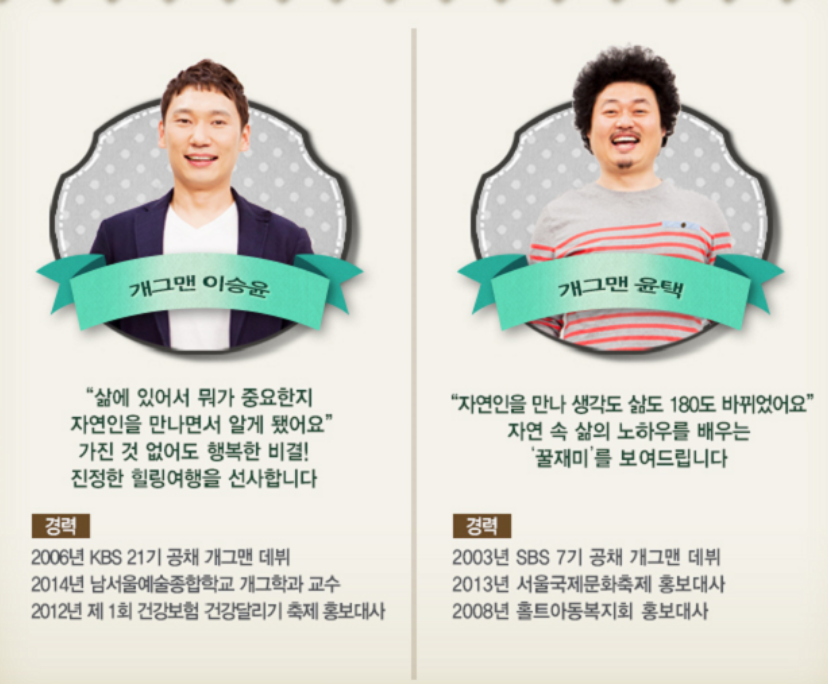 - 고정 출연진: 개그맨 윤택과 이승윤이 번갈아가며 2회 차마다 출연합니다.