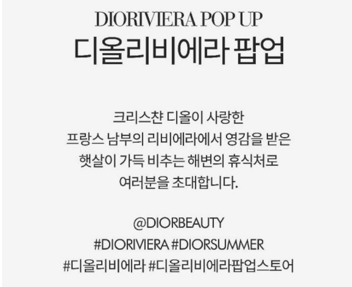 성수 디올 디올리비에라 팝업스토어 안내 디올 성수에서 새롭게 선보이는 디올리비에라 팝업스토어는 다양한 디올 상품들을 만날 수 있는 특별한 공간이 될 것입니다. 작년 팝업스토어에서는 예쁜 포토존과 향수 샘플 같은 선물이 제공되었으며, 올해도 다채로운 포토존과 선물이 준비될 예정입니다.