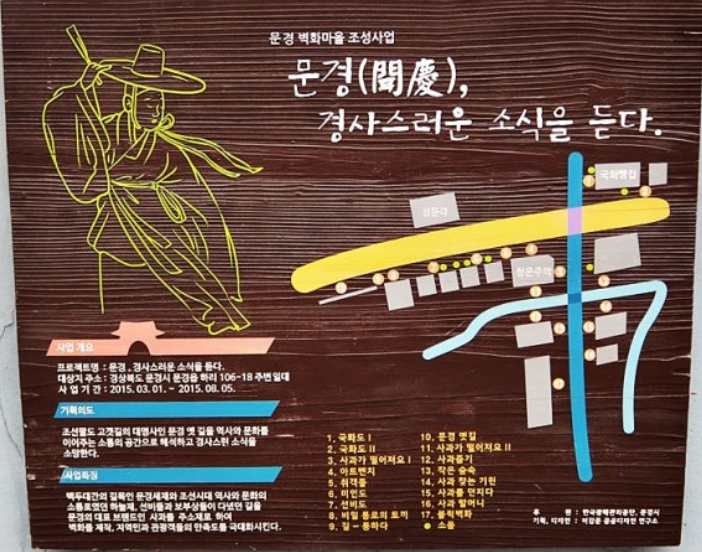 문화와 예술의 조화: 문경읍 하리 벽화거리는 문경새재 및 하늘재를 거닐었던 선비들의 이야기와 지역의 대표 특산물인 사과를 소재로 한 벽화가 특징입니다. 이 벽화들은 문경의 역사와 문화를 예술적으로 표현하여 방문객들에게 시각적 즐거움을 제공합니다.