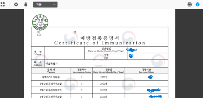 7. 화면에 보이듯이 예방접종증명서가 뜨니 프린트해서 내시면 됩니다.