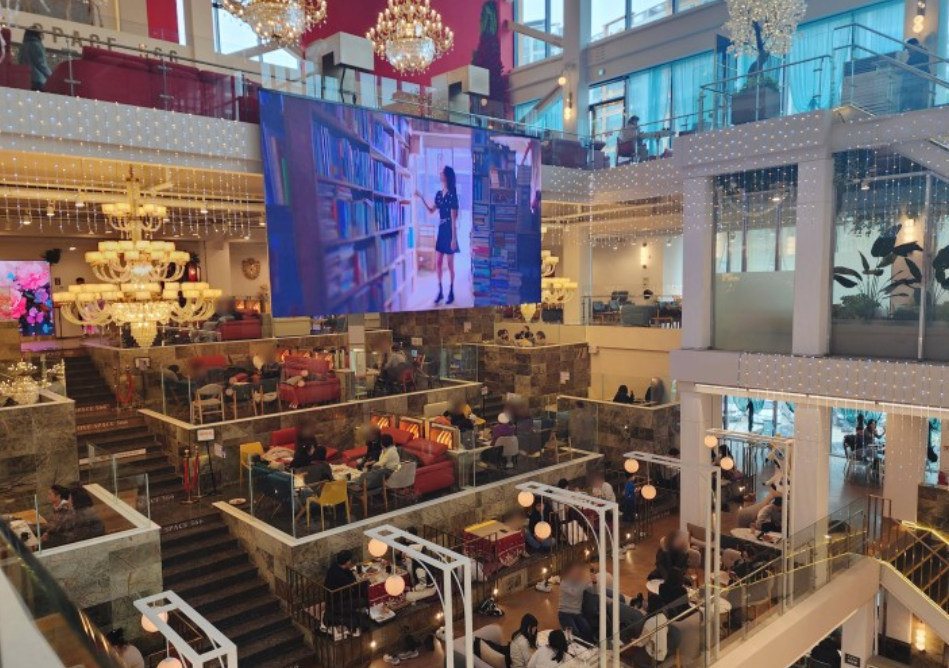 이러한 대규모 카페는 호텔식 경영 방식을 취하고 있으며, 지하 1층부터 지상 5층까지 다양한 테마와 공간을 제공합니다. 입구에서부터 방문객을 압도하는 웅장한 샹들리에와 세련되고 고급스러운 인테리어는 이곳이 단순한 카페를 넘어선 문화 공간임을 암시합니다.