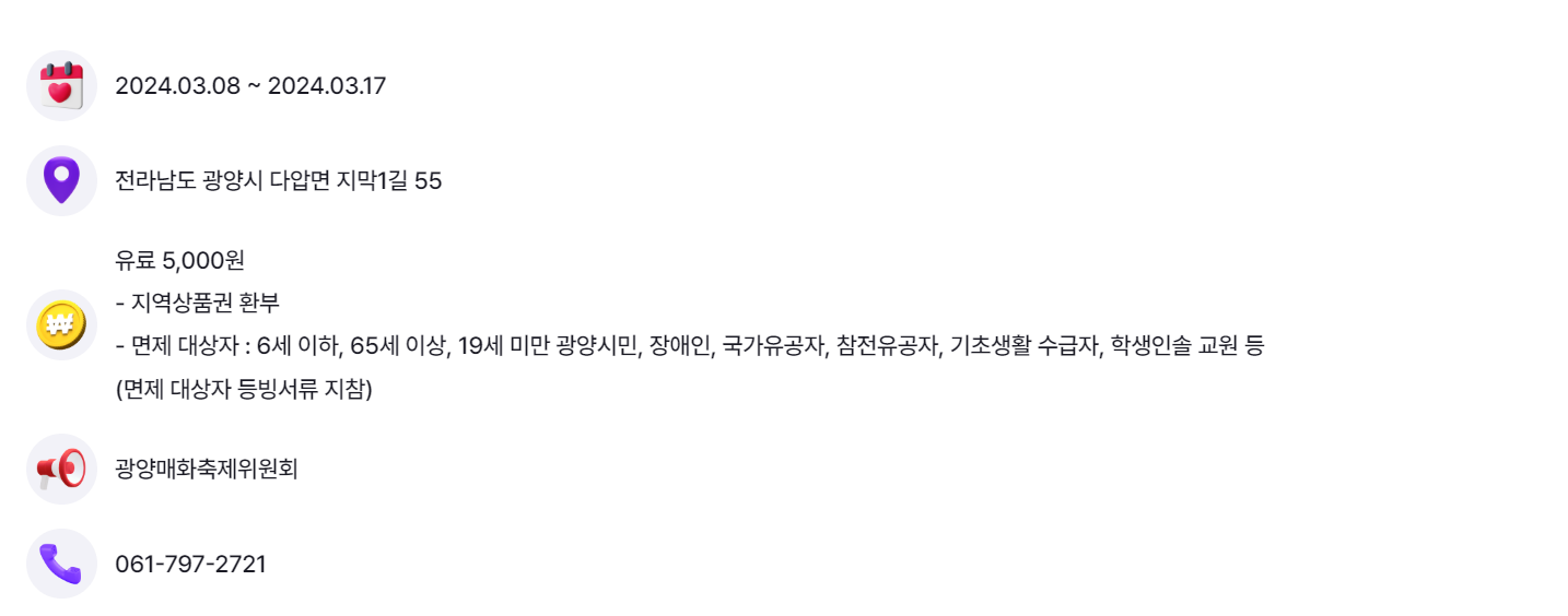 매화축제뿐 아니라 광양 전어축제, 전통숯불구이 축제,천년 동백축제 등 가볼만한 축제가 많은지역이죠