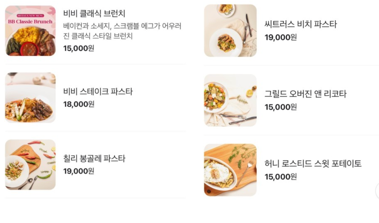 - 브런치 및 식사: 브런치부터 파스타, 샐러드 등 다양한 식사 메뉴 준비